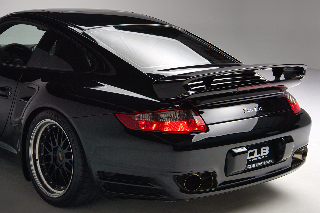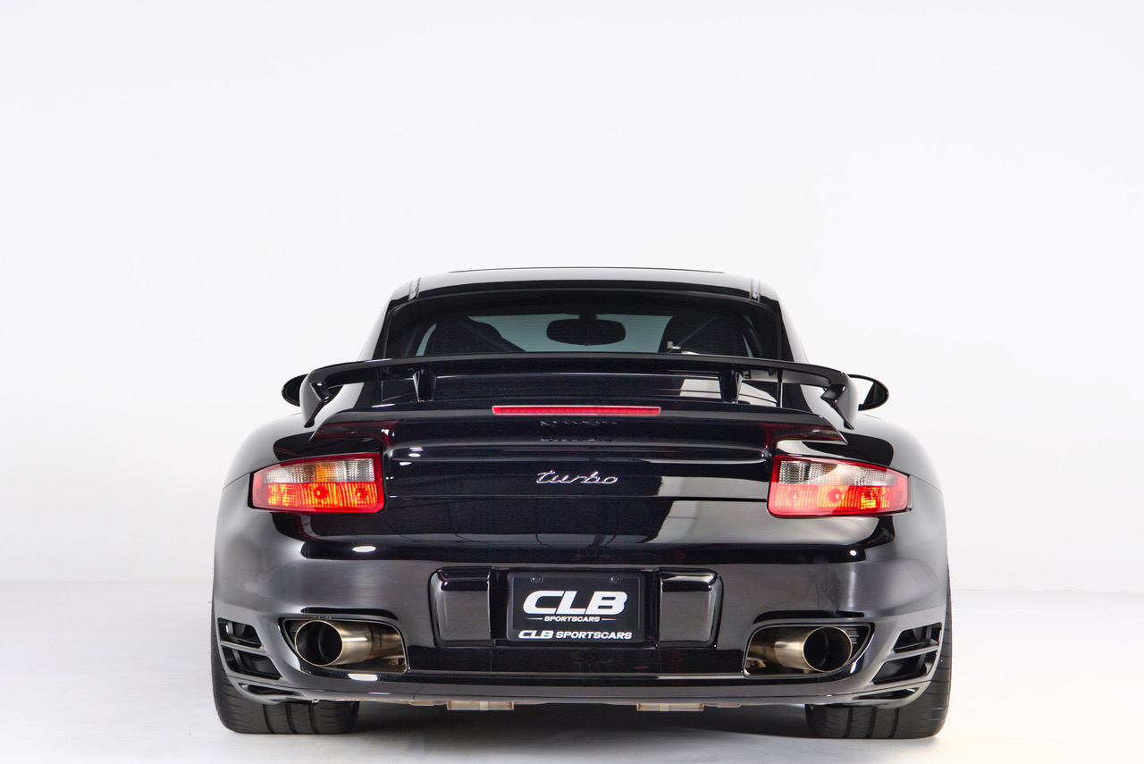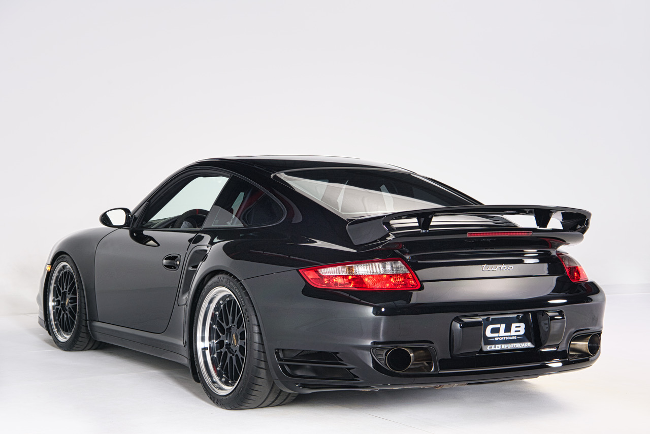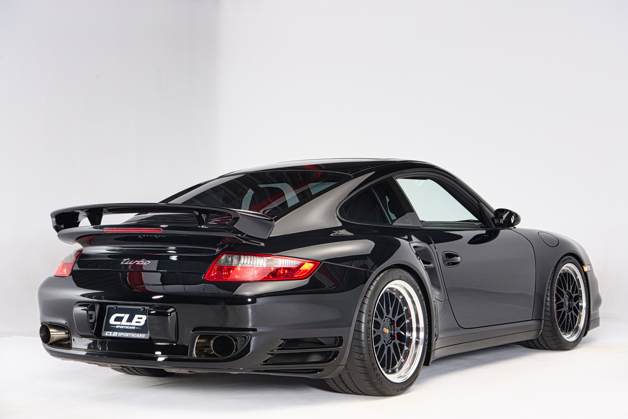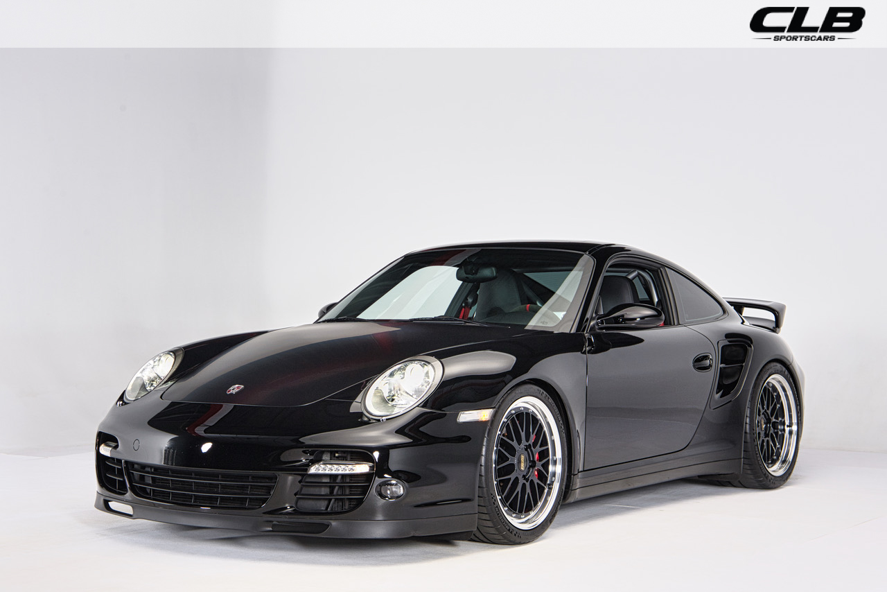 CLB Sportscars is thrilled to offer this 2007 Porsche 911 Turbo finished in Black over Black Interior. This gorgeous 6-speed 997.1 Turbo arrives with just 25,767 miles from new and features an array of tasteful upgrades that enhance the experience that only a 911 Turbo can deliver. A GMG 3.5 inch Exhaust with slash cut tips enhances the 3.6L Mezger’s soundtrack and is paired with a ByDesign Stage 2 Tune. The car sits on Bilstein Coilovers front and rear and wears a set of fresh Michelin Pilot 4S tires. Inside, a 991.2 GT3 Steering Wheel and PCCM Head Unit help modernize the full black leather interior, and a GMG roll cage sits in back. This is a perfectly dialed 997.1 Turbo and benefits from long term collectibility with its factory 6-speed transmission.