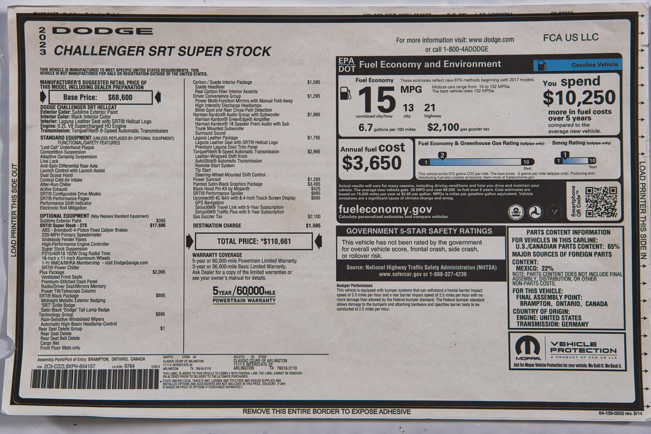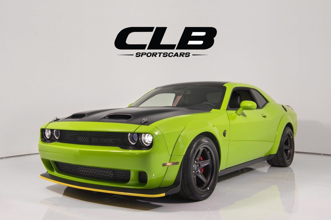 CLB Sportscars is excited to offer this 2023 Dodge Challenger SRT Super Stock! Delivered new through Classic Chrysler Dodge Jeep Ram of Arlington, TX, this example left the Brompton, Ontario factory in Sublime Metallic over Black Leather Interior and features over $30k in additional options. Key highlights include the Painted Satin Graphics Package, Laguna Leather Package, Harman Kardon 18-speaker Sound System, and much more. This example arrives with just 16 miles on the odometer and retains factory interior plastics from delivery. With just 276 reported examples produced for the Super Stock’s final model year, this example represents a tremendous opportunity in today’s marketplace.